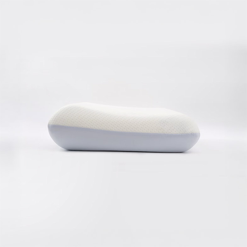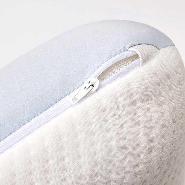 枕型方面採用人體工學曲線設計,不對稱式三段高低:中段9公分、兩側分別為10與12公分,使用者可依自身睡姿偏好與肩頸曲線需求,調整最合適的支撐高度,目的在於提供動態貼合的睡眠支撐,特別適合側睡與仰睡交替者。附加的枕套設計同樣具備雙面配置:藍色面選用高科技涼感紗線織成,接觸即感降溫;白色面則為聚酯纖維,柔軟透氣,適合氣候較冷或空調房間中使用。這種材質上的雙向思考,不僅延長了產品的使用週期,也強化了枕頭的整體機能彈性。
